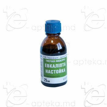Настойка (1:5) листьев эвкалипта на 70% спирте; во флаконах по 25 мл.